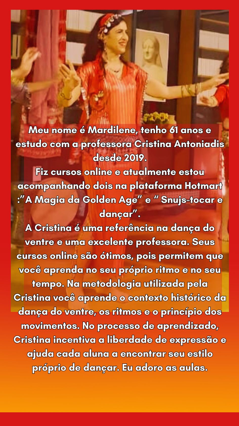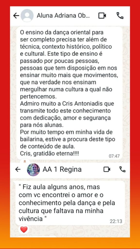 Neste curso trago um embasamento completo DESDE O INÍCIO DO APRENDIZADO, com apostilas, materiais e muito conteúdo teórico e muita prática também. A Dança do Ventre não é uma dança totalmente livre, ela carrega aspectos culturais de uma região cheia de história e peculiaridades, e isso gera muitas dúvidas e limitações no desenvolvimento do aprendizado e da criatividade. Por isso, para aprender de verdade a dançar é imprescindível que o ensino seja completamente integrado com os fatores históricos, culturais e principalmente musicais que envolvem a dança do ventre.