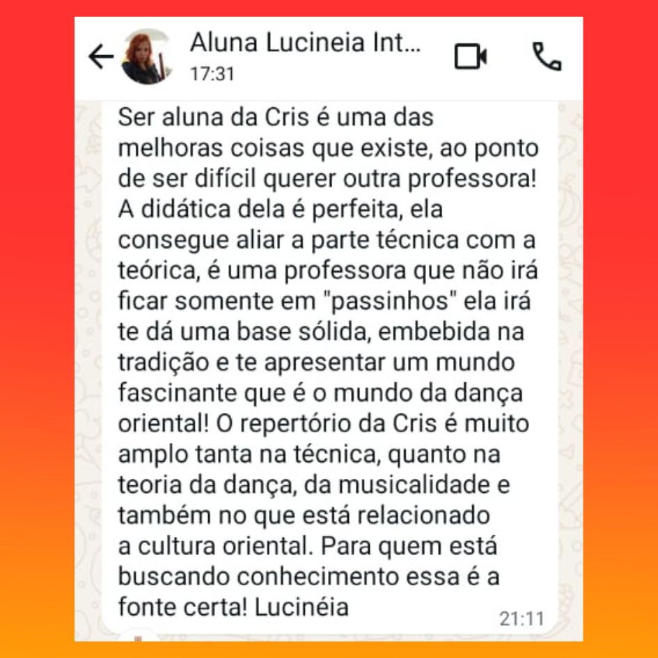 O entendimento do contexto histórico, a absorção e domínio das sonoridades da música oriental, o entendimento do seu corpo, a prática correta dos movimentos e o treino levarão sua dança para outro nível de intimidade, e isso irá te proporcionar a liberdade de criação e a segurança de dançar A SUA DANÇA com propriedade!!
